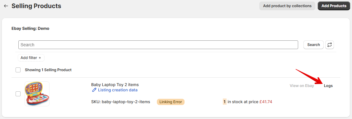 To find out more about the error, check the logs for the affected item. Click “Logs” and look for the latest messages. Logs indicate if some information is missing, a seller account needs an update, or if there is an issue in the app configuration.