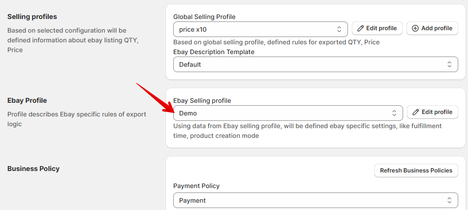 To confirm that the products are using this profile, go to Selling List settings and scroll down to the Ebay Profile section. Make sure that the intended profile is selected here: