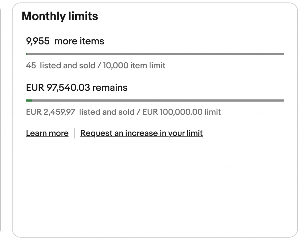 To view your current monthly limit, head to your Seller Hub, open the Overview page, and scroll to the Monthly limits section: