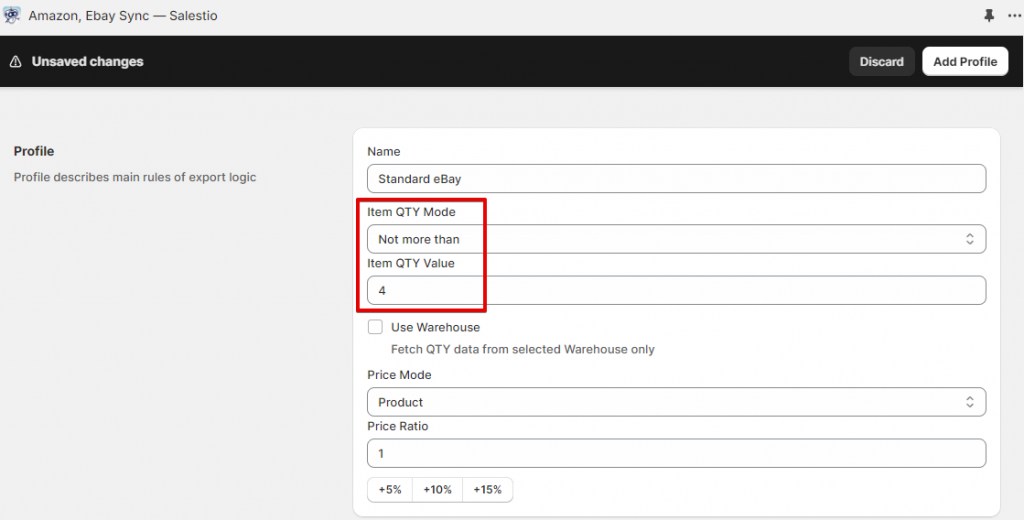 Salestio offers a workaround in the Global Profile settings. Go to Profiles > Global Profiles and select yours. In “Item QTY Mode” select “Not more than”. This mode will keep updating the item count on eBay while keeping it under “Item QTY Value”. We will set it to 4 for our store.